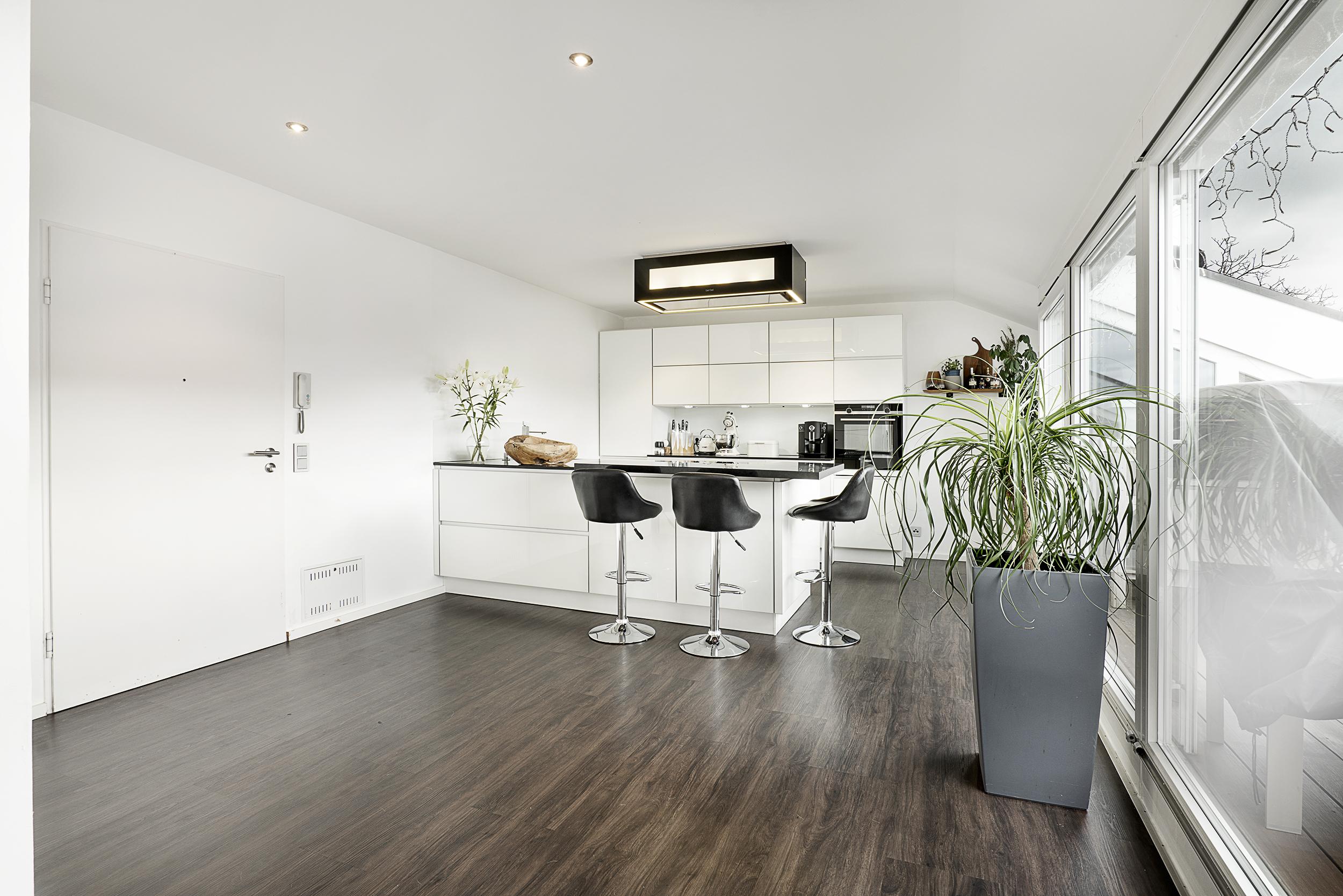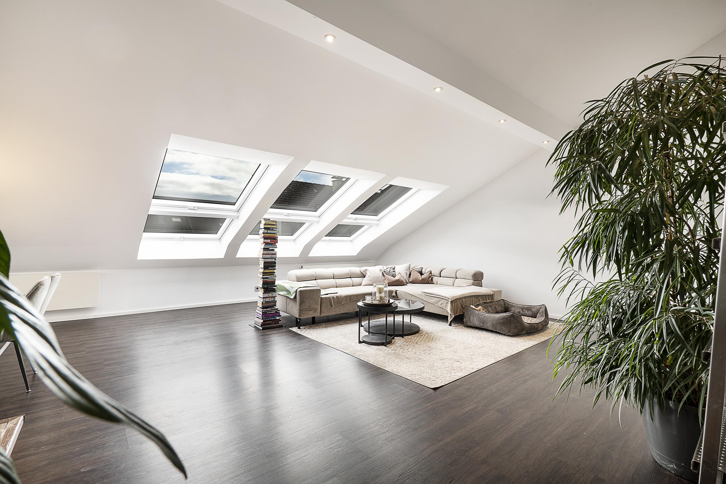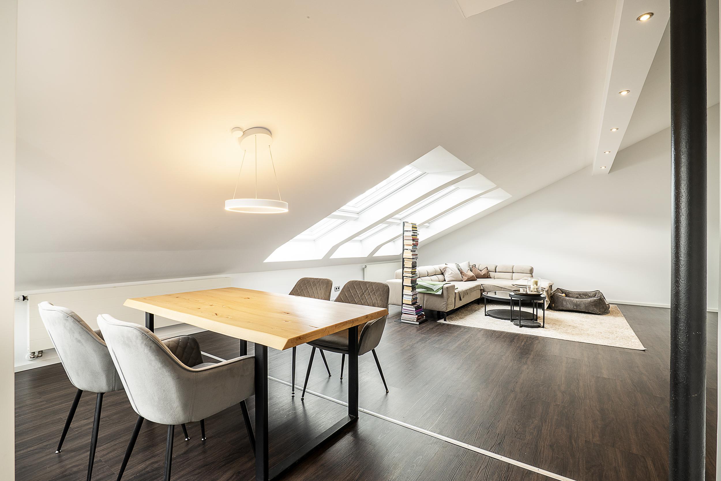 Die moderne und loftartige 3,5-Zimmer-Dachgeschosswohnung, welche im Jahr 2014 unter Verwendung hochwertiger Materialien kernsaniert wurde und über eine Wohnfläche von 148,45 m² verfügt, befindet sich in einem gepflegten Mehrfamilienhaus in sonniger Höhenlage von Konstanz-Wollmatingen. Das Haus verfügt über eine Hochparterreebene, ein Obergeschoss sowie das Dachgeschoss. Der Zugang zur Wohnung erfolgt durch das Treppenhaus. Der Grundriss überzeugt durch einen sehr großzügigen und sonnenverwöhnten Wohn- und Essbereich mit integrierter Einbauküche, zwei separate Schlafzimmer sowie zwei Bäder. Eine kleine Empore/Galerie, welche durch eine Leiter zugänglich ist, rundet das komfortable Platzangebot weiter ab. Ein besonderes Highlight ist die nach Süden ausgerichtete Dachterrasse, welche gerade in den Sommermonaten eine entspannte Zeit im Freien garantiert. Zur Wohnung gehören zwei separate Kellerräume sowie ein PKW-Stellplatz in der hauseigenen Tiefgarage. Das gepflegte Rasengrundstück ums Haus herum steht den Bewohnern gemeinschaftlich zur Verfügung.